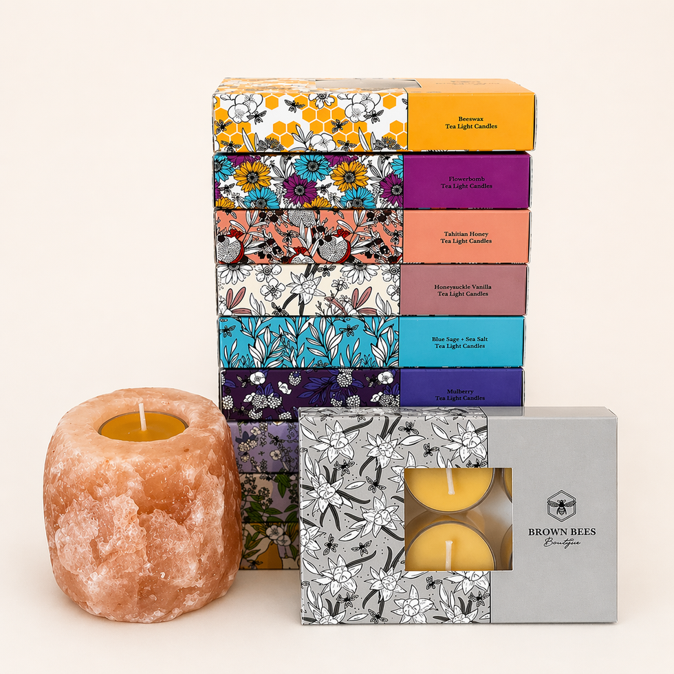 Hand-poured and packaged. Pure beeswax and beeswax with coconut blend scented clear cup tea light candles (6 pack).
